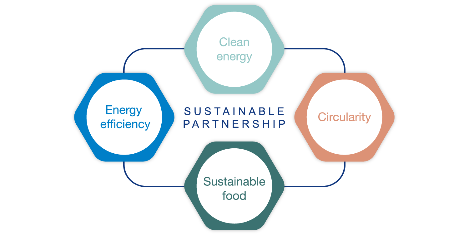 Stiamo accelerando le soluzioni sostenibili in quattro aree: efficienza energetica, energia pulita, cibo sostenibile e circolarità.