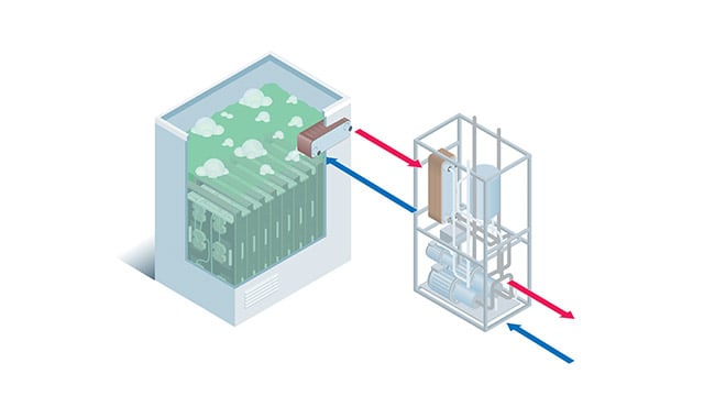 In un sistema (direct-to-CPU), il liquido raffredda direttamente i componenti caldi, tramite una piastra fredda a contatto con la CPU. Lo scambiatore di calore a piastre, posizionato all'esterno del rack del server, raffredda il fluido che viene scaldato dall'unità di distribuzione del refrigerante (CDU) durante il funzionamento. Lo scambiatore di calore funziona come un interruttore di circuito tra i fluidi nei sistemi riducendo al minimo richiesto il volume di refrigerante e fornire così una migliore efficienza in termini di costi.
