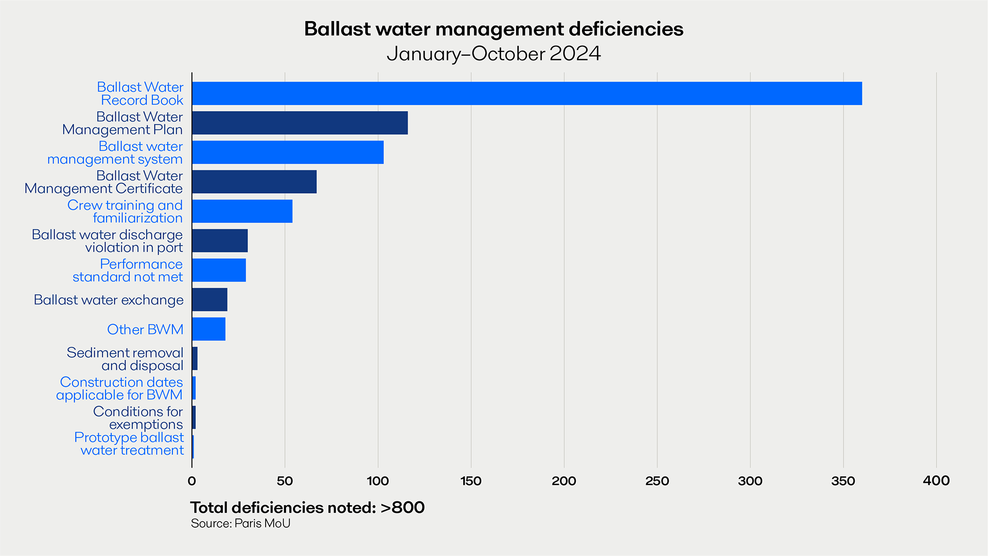 The chart below shows recent deficiencies in ballast water management, based on Memorandum of Understanding (MoU) data. The most common are deficiencies in the Ballast Water Record Book, where either the entries were not made properly or the book itself was missing.