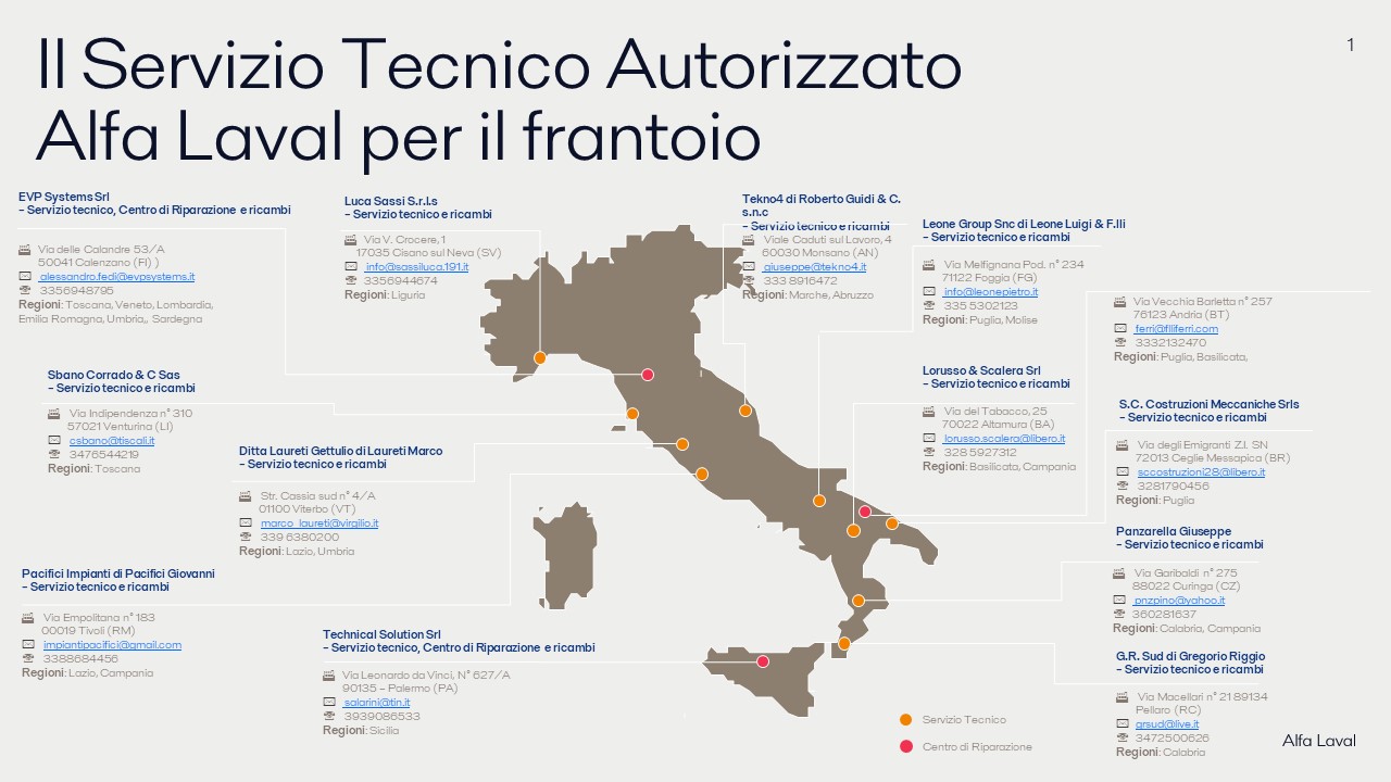 - Competenze a livello locale con centri di assistenza e partner vicini al vostro frantoio
