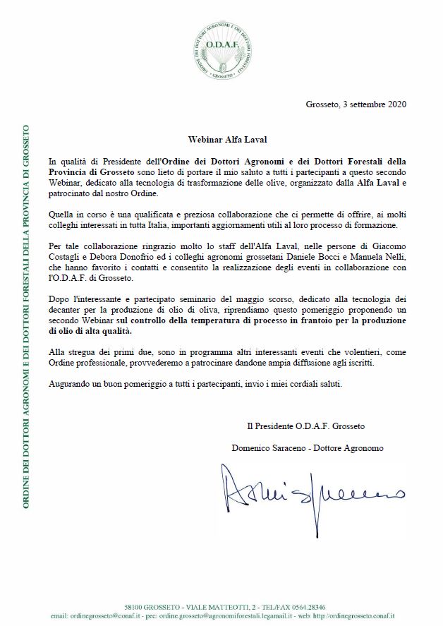 Ringraziamo il Presidente O.D.A.F. di Grosseto, il dott. Domenico Saraceno, per la sua graditissima lettera. Alfa Laval è lieta di continuare la collaborazione per i prossimi eventi.