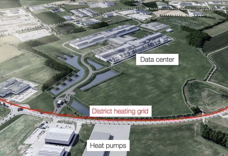The heated air from cooling the servers flows via water coils, recovering the heat by raising the temperature of the water. This water is then supplied to a newly constructed heat pump installation where the temperature is raised further and delivered to the district heating network and distributed to the local community.