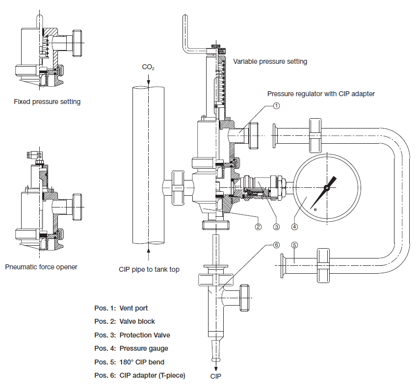Il regolatore di pressione serbatoio richiede pulizia tra un lotto e l’altro. Può essere integrato nella procedura CIP del serbatoio tramite l’adattatore CIP opzionale. Prima della pulizia, l’adattatore CIP viene montato sul regolatore di pressione serbatoio; esso forza l’apertura della valvola di alimentazione gas e della valvola di scarico pressione, consentendo la pulizia completa. Durante la procedura CIP, tutte le funzioni sono bloccate. Vedere lo schema del regolatore.