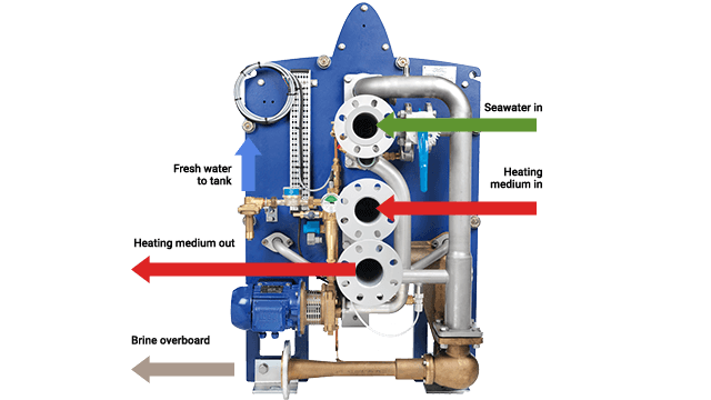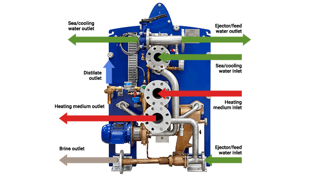 Feed water enters the lower (evaporator) section of the plate pack, where the plates are warmed by engine jacket cooling water or a closed circuit heated by steam. This causes the water to evaporate at around 40¬–65°C in a vacuum of 75–99%, which is maintained by the brine/air ejector. (The exact temperature and vacuum ranges depend on the AQUA Blue model.) For the AQUA Blue E1 C-type and S-type, a high-pressure option is available for jacket water pressures up to 6 bar.