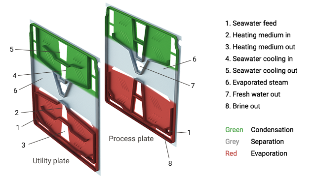 AQUA Blue freshwater generators comprise a single type of titanium plate that handles all three aspects of vacuum distillation: evaporation, separation and condensation. Only the gasket configuration differs between the process and utility plates (see illustration). Because the process vacuum is contained within the plate pack itself, no outer shell is necessary.